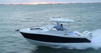 Console & Top Powdercoated Aluminum T-Top with Electronics Box, Rod Holders (4), & LED Spreader Lights (2) 3/8″ Clear Acrylic Windshield Walk-in Console (5’2″ head-room) Stainless Steel Steering Wheel Hydraulic Seastar® Steering w/ Tilt Helm Ritchie Compass Console Mounted Porta-Potti Stainless Steel Cockpit Toe Rails (2) Raw Water Washdown Outlet Fresh Water Shower w/ 6 Gallon Tank Radar Plate for T-Top or Hardtop Canvas T-Top w/ Rod Holders (4) & LED Spreader Lights (2)